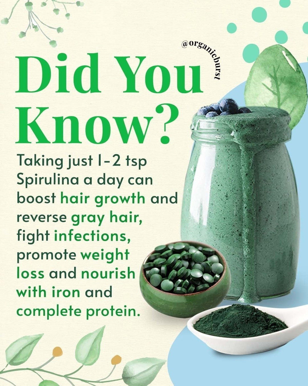 The Spirulina has helped my hair so much. My hairline looks fuller and I have less hair falling out. I also had 4 grey hairs which were worrying me since I’m only 29 and somehow those have also reversed and I wasn’t expecting that!